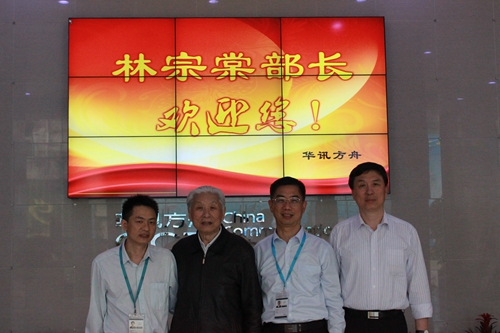 4月28日,中國名牌戰略推進委員會主任、原國家航空航天工業部部長林宗棠,加拿大華人學者林云教授蒞臨華訊參觀指導?! 〖瘓F副總裁丁慶、總裁辦主任何忠洲,陪同林宗棠部