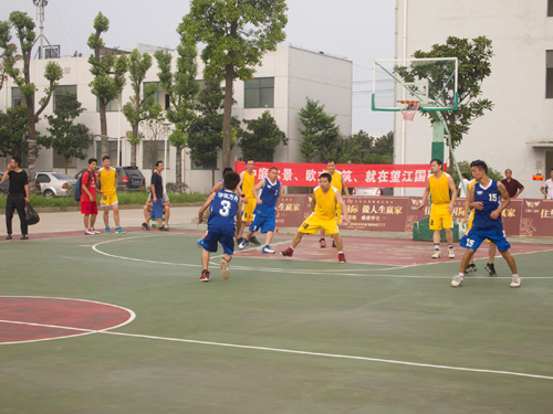8月25日,華訊方舟科技(湖北)有限公司籃球隊員及啦啦隊員整齊著裝、士氣高昂參加“望江杯”籃球賽?! 〗洑v了第一場的試煉,此時的隊員們配合更加默契、戰術更